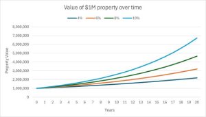 So what happens to (say) a $1 Million property in 5, 10, 15 or 20 years if the average increase in value is 4%, 6%, 8% or 10% every year?